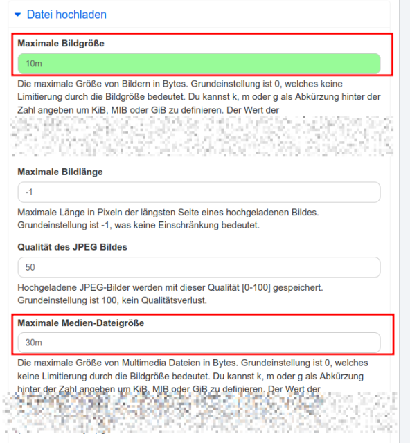 •Nachdem du die ini Datei nach oben gesetzt hast, solltest du schauen, was du im Admin-Bereich (/admin/site) hinterlegst hast. Das ist nach Bild- und Videodateien getrennt einstellbar.